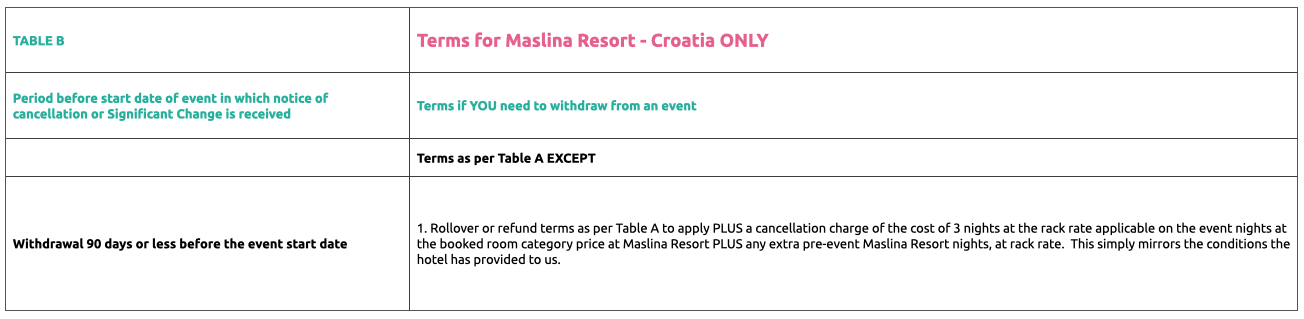 The following table summarises the sums payable to us or you in the event of Significant Changes or Cancellation. These sums are not payable where we have to make a Significant Change or cancel your event entry as a result of matters outside of our control when clause H1 shall apply.